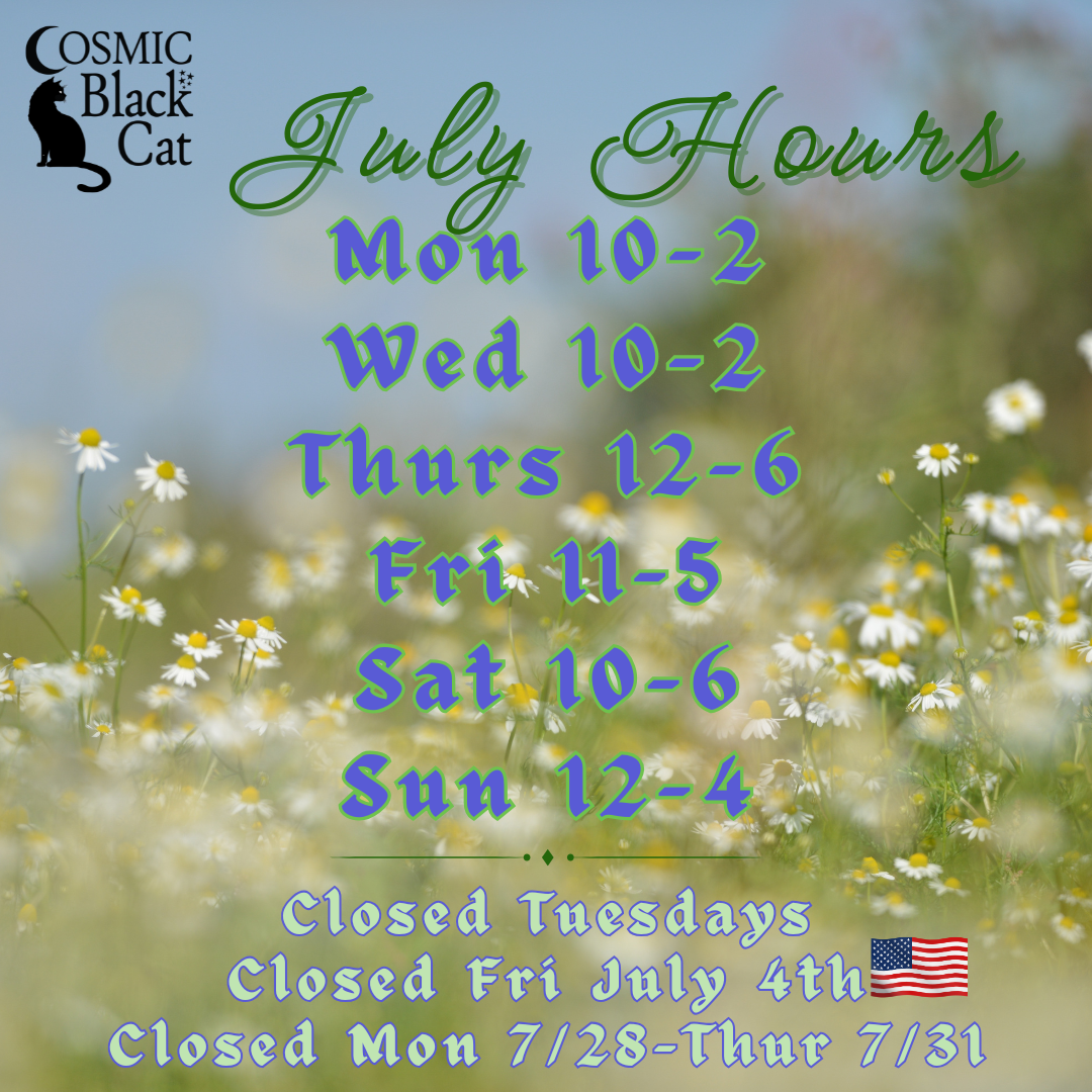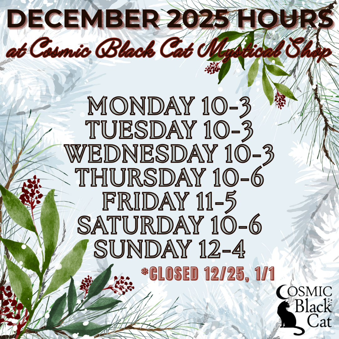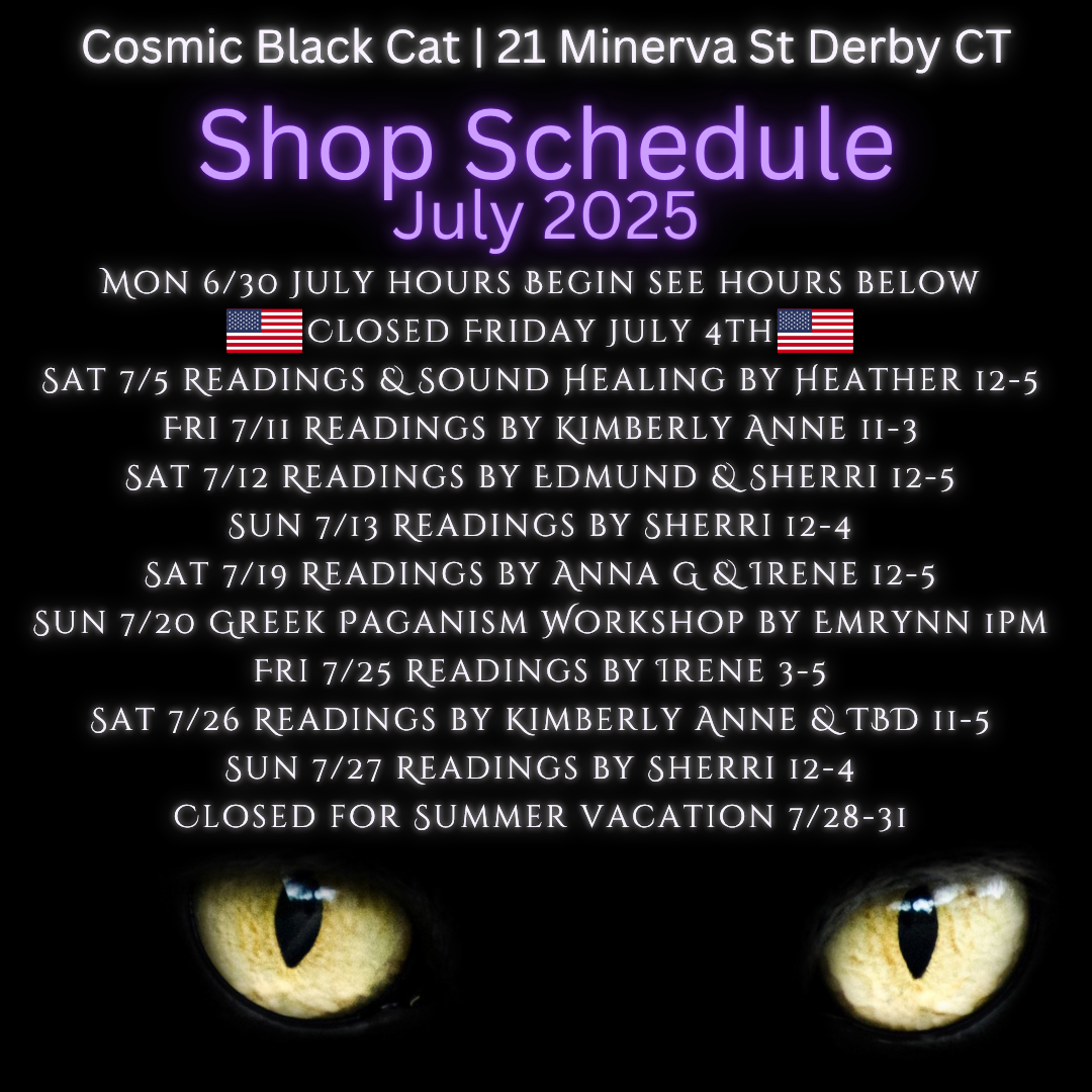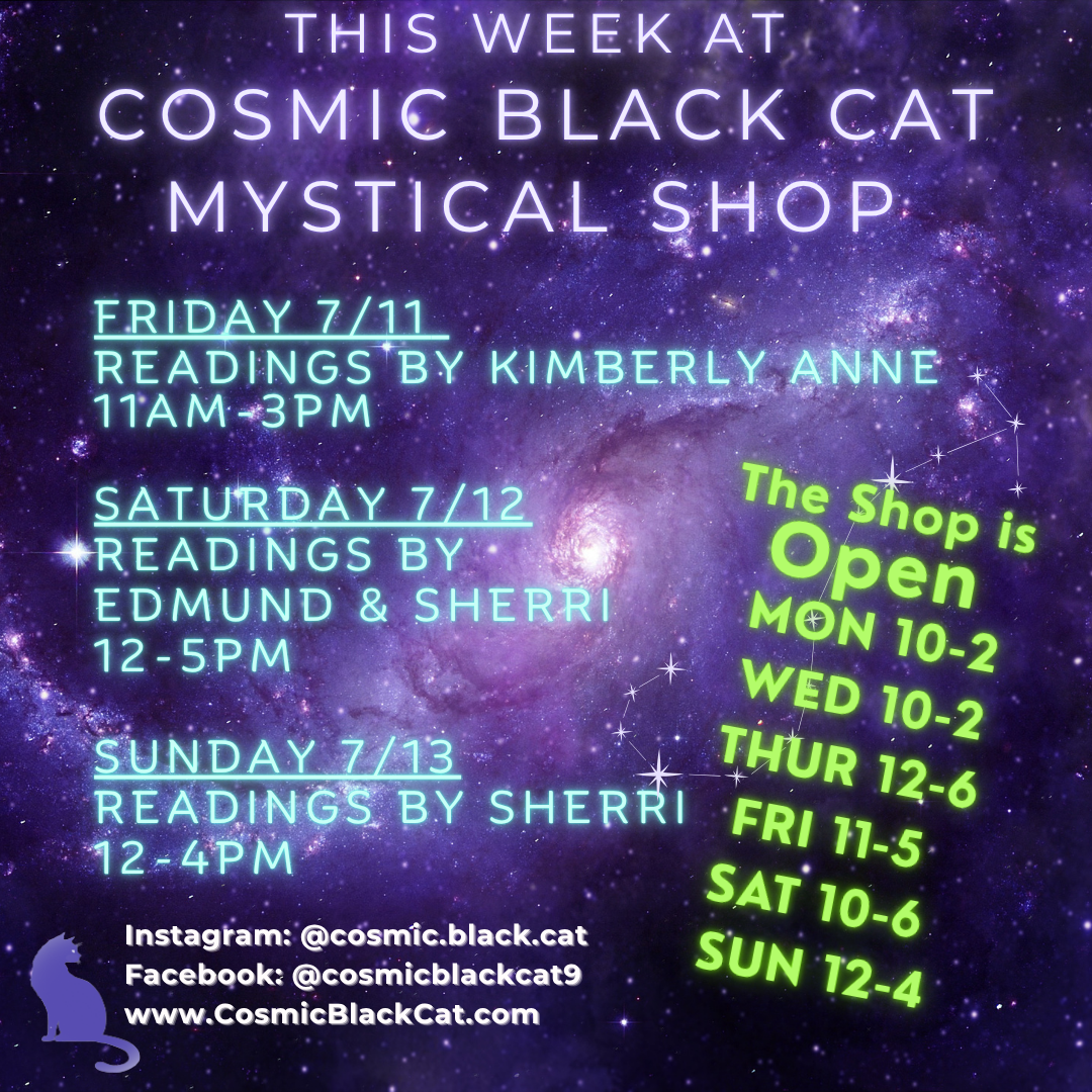 This week at Cosmic Black Cat, our hours remain the same—we’re open seven days a week. Readings this weekend: Friday with Edmund from 12–5 ($10 mini readings or $40 for 30 minutes), and Saturday with Anna G and Irene from 12–5 ($40 for 30 minutes).