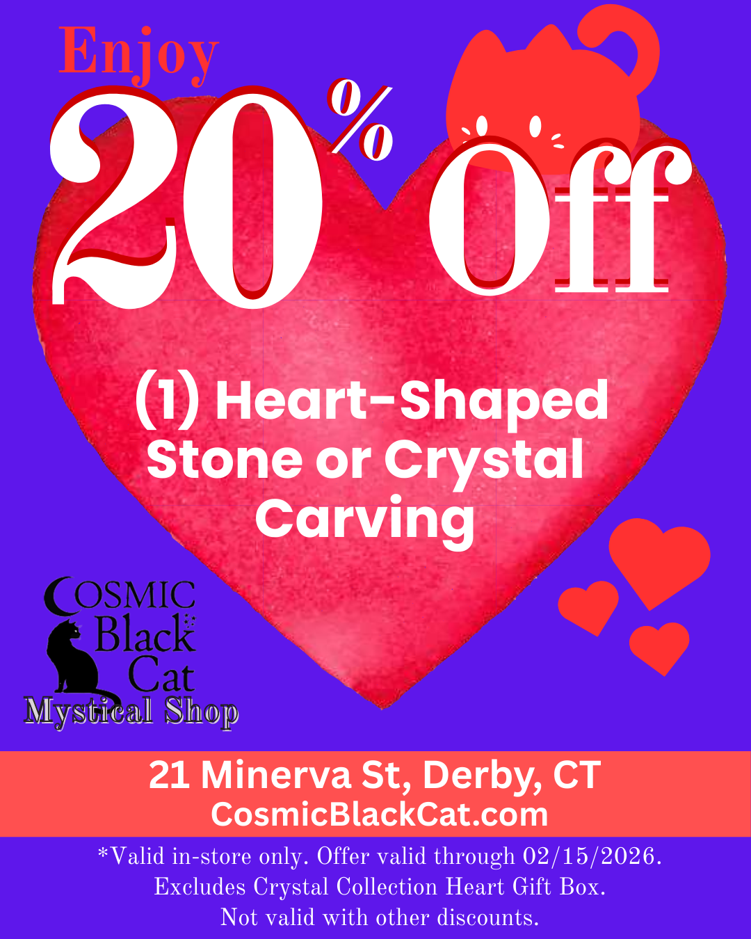 Enjoy 20% off (1) Heart-Shaped Stone or Crystal Carving. Click here to show or print coupon for discount in store. Offer valid until 02/15/26.