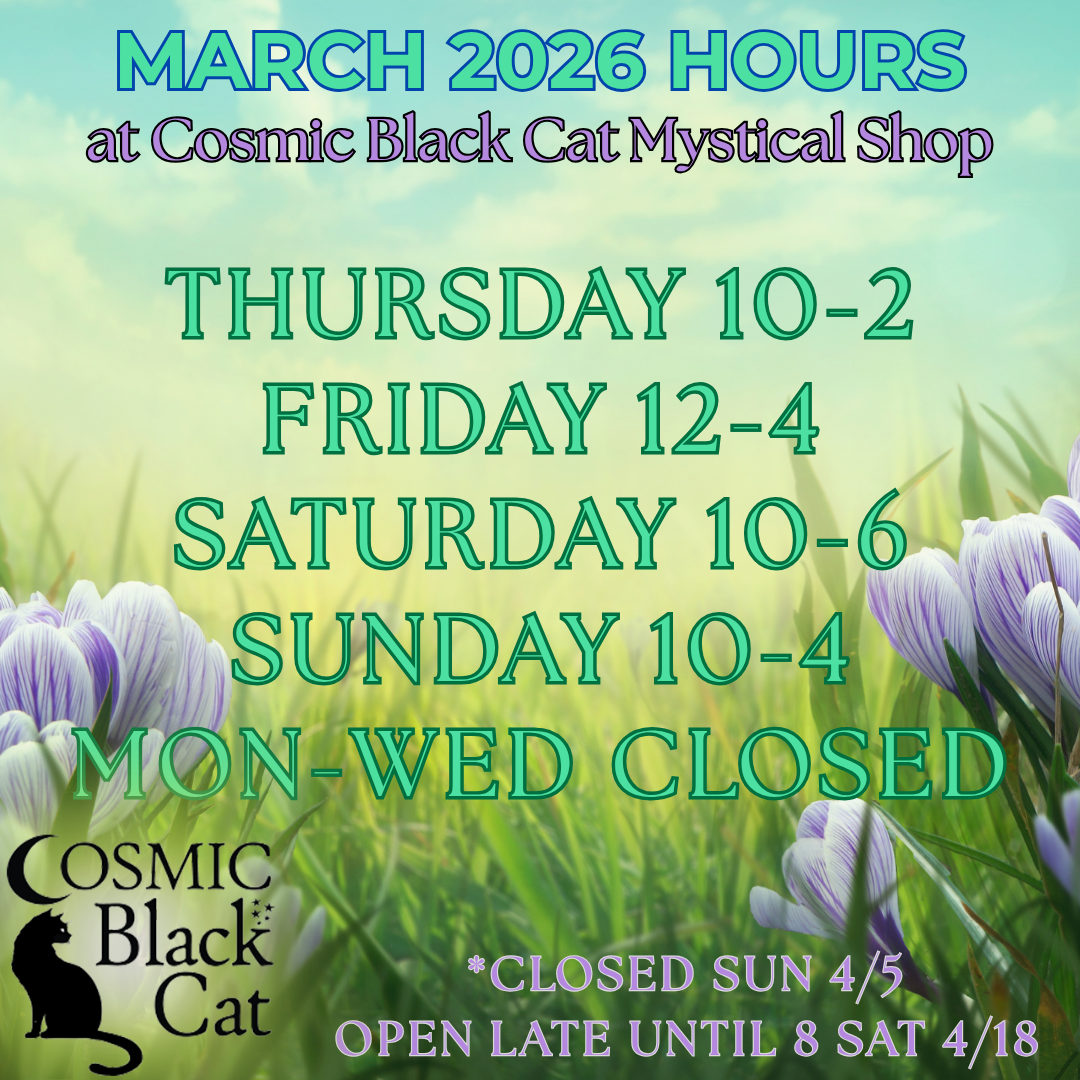 We're open Friday 4/3 12-4 and Saturday 4/4 10-6. Book an appointment with one of our readers, available both days, walk-ins welcome. Closed this Sunday 4/5.