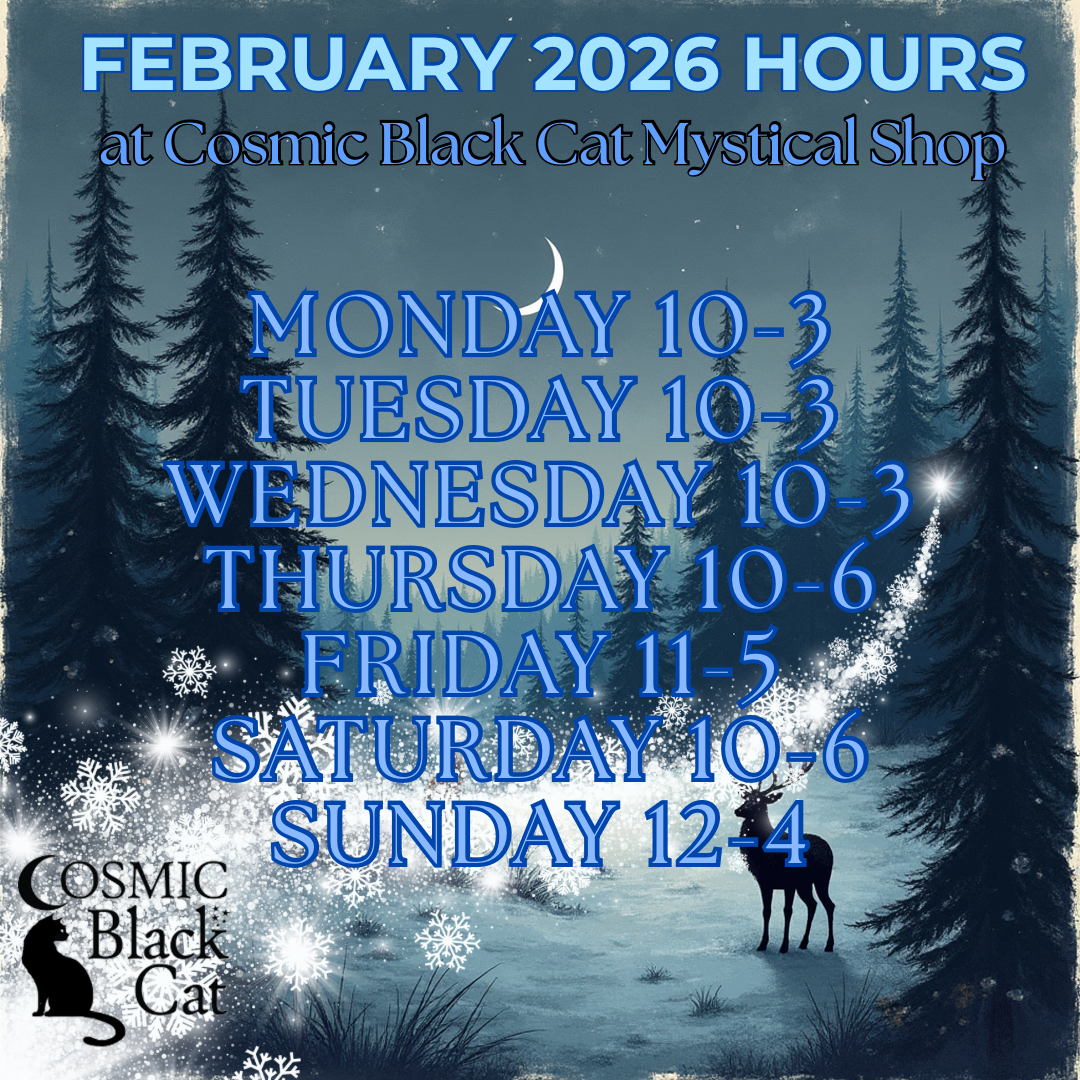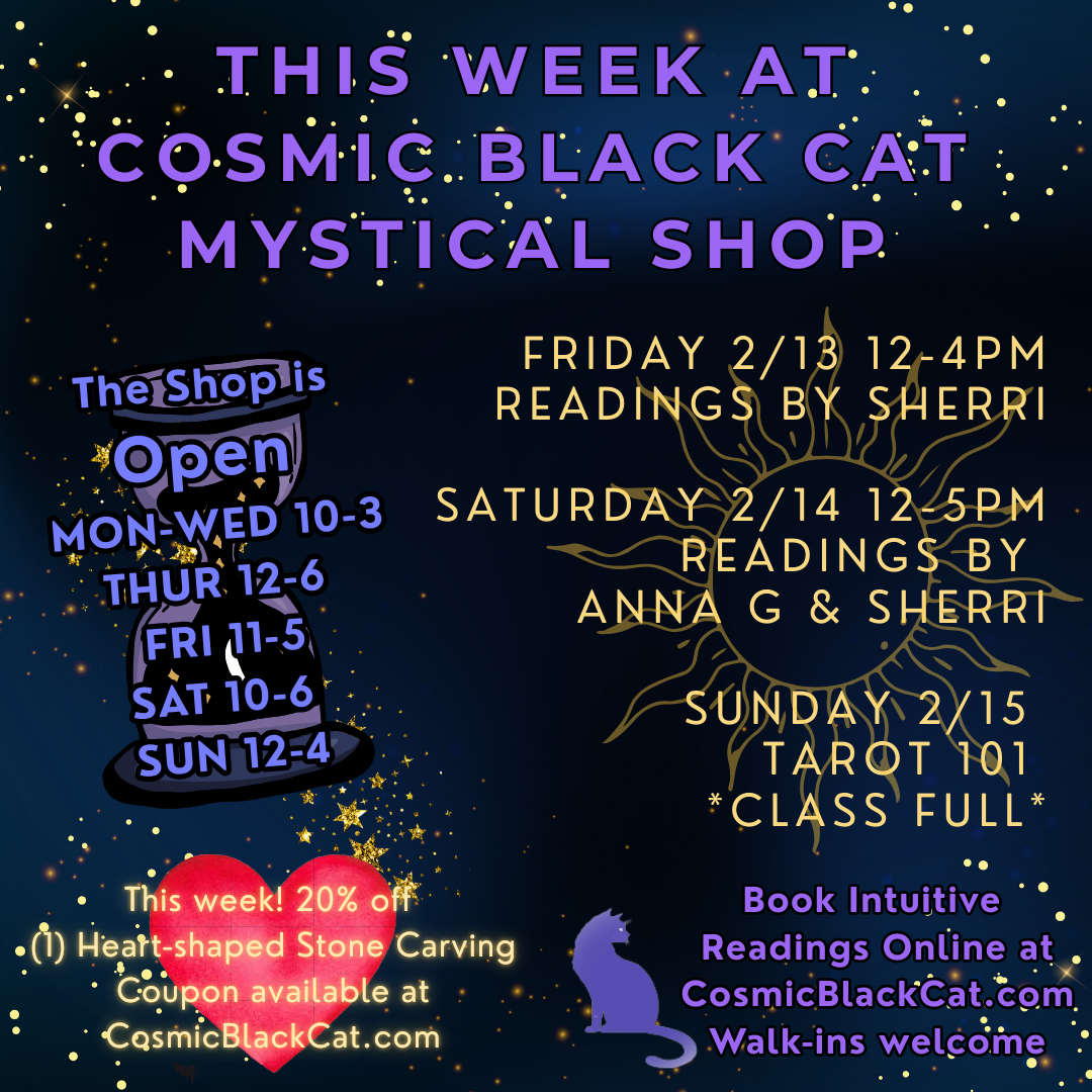 This week at Cosmic Black Cat Mystical Shop. Our shop is open 7 days with readings this Friday and Saturday. Book now for your appointment, walk-ins always welcome. Get your coupon for 20% off (1) heart-shaped crystal carving this week only by clicking here. Tarot 101 continues this Sunday and our shop is open.