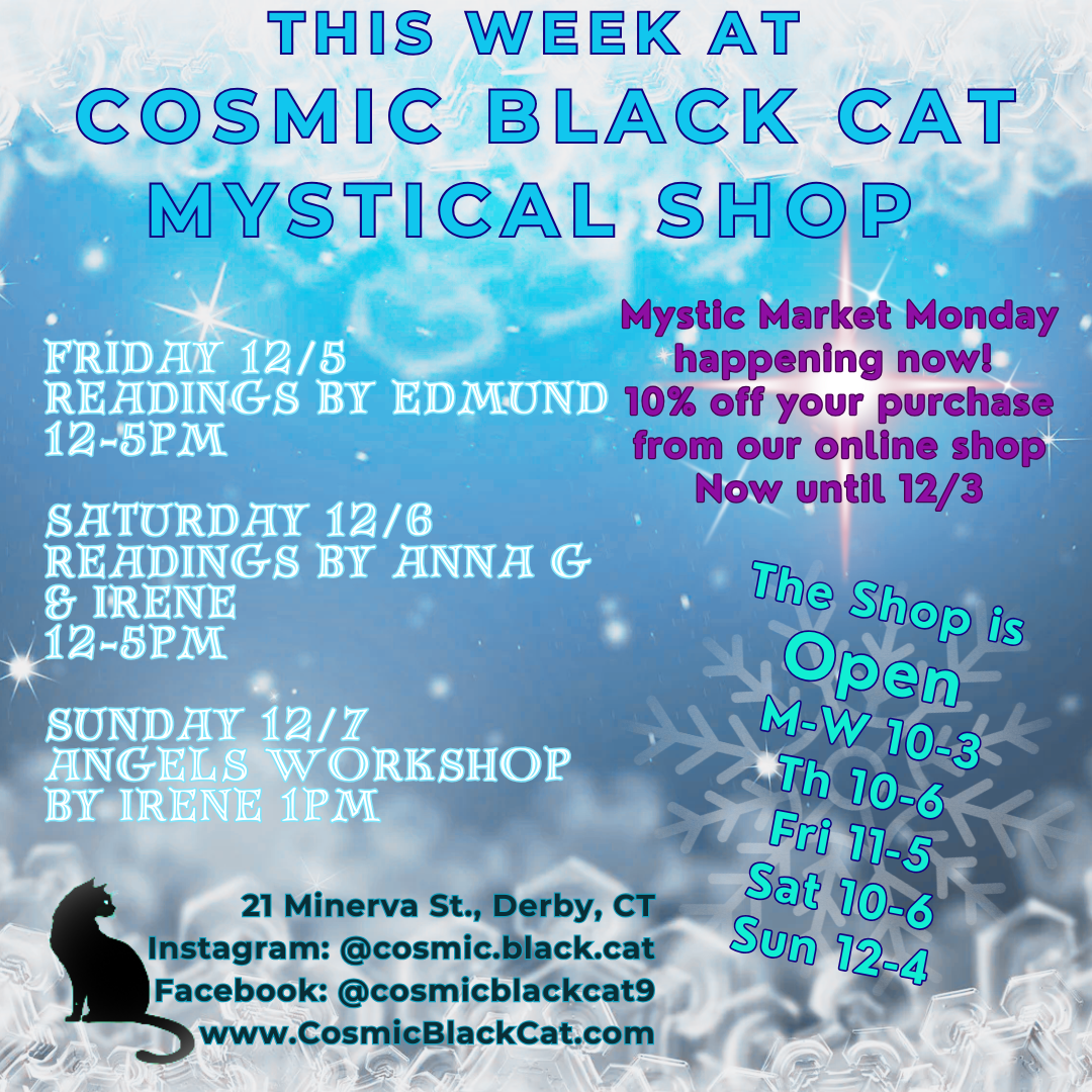 Join us next Sunday, 12/7 at 1pm, for our Angels Workshop with Irene. The 1.5-hour workshop is $35 (cash/Venmo) and includes Angel Oracle Cards. Call or text 203-516-7203 to reserve your spot; payment is required to secure registration. Our reader's bios are here through this link: Readers at Cosmic Black Cat