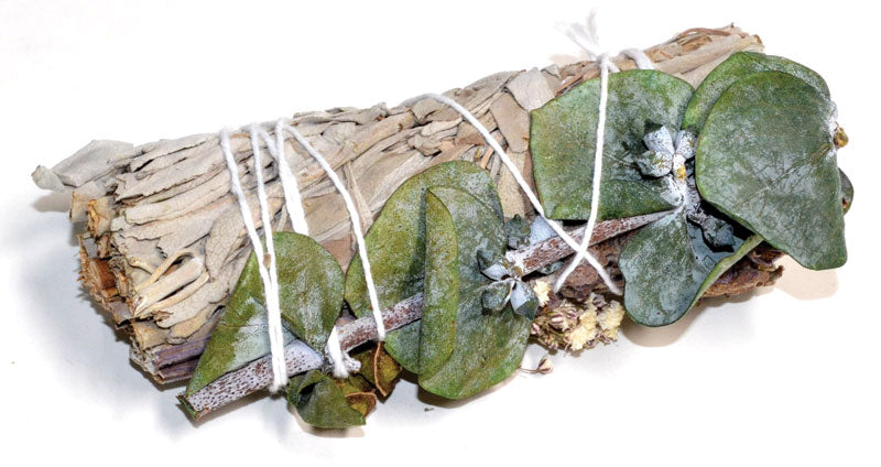 A trio of delightful and healing scents. This 4" white sage bundle is twinned together with Eucalyptus and Lavender creating a calming and inviting scent. 4" smudge stick, sizes may vary slightly.