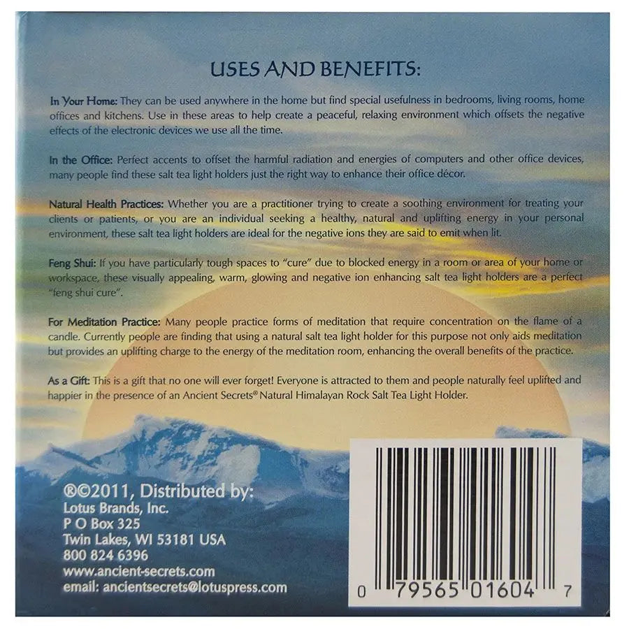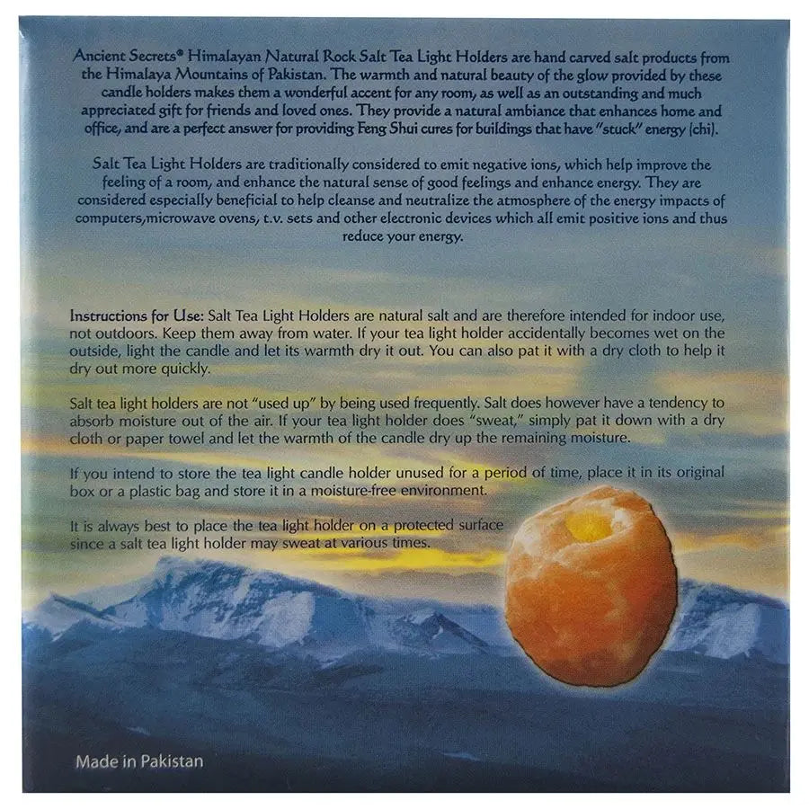 Ancient Secrets Himalayan natural Rock Salt Lamps are hand carved salt products for the Himalayan Mountains of Pakistan. The warmth and natural beauty of the glow provided by these candle holders makes them a wonderful accent for any room, as well as an outstanding and much appreciated gift for friends and loved ones. They provide a natural ambiance that enhances home and office, and are a perfect answer for providing Feng shui cures for buildings that have "stuck" energy.
