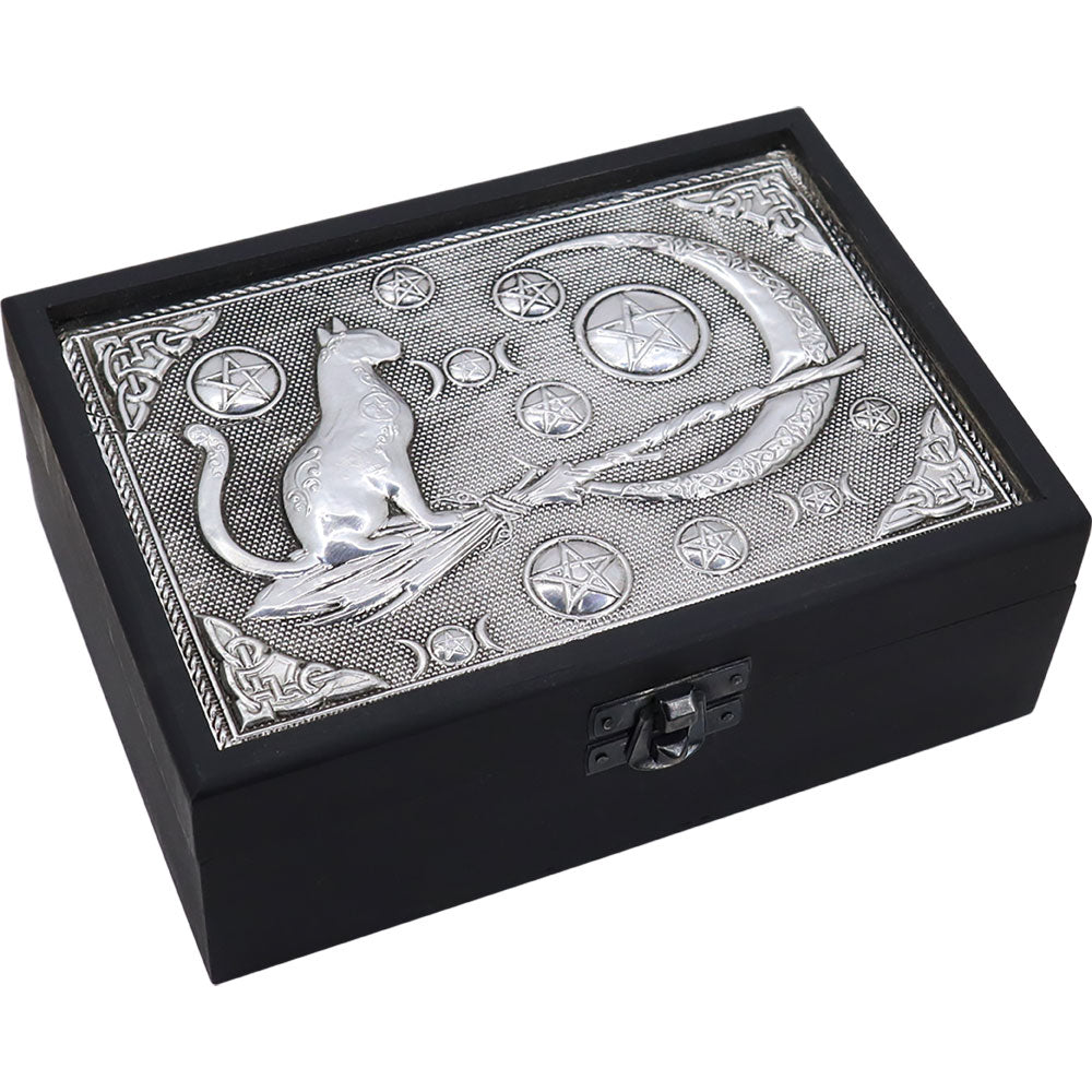 Crescent Moon with Cat & Broom Velvet Lined Metal Top Wooden Box