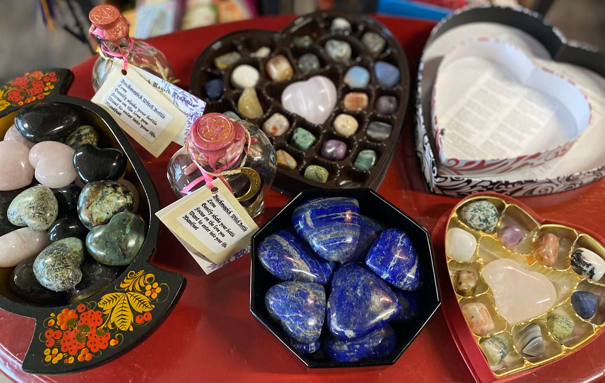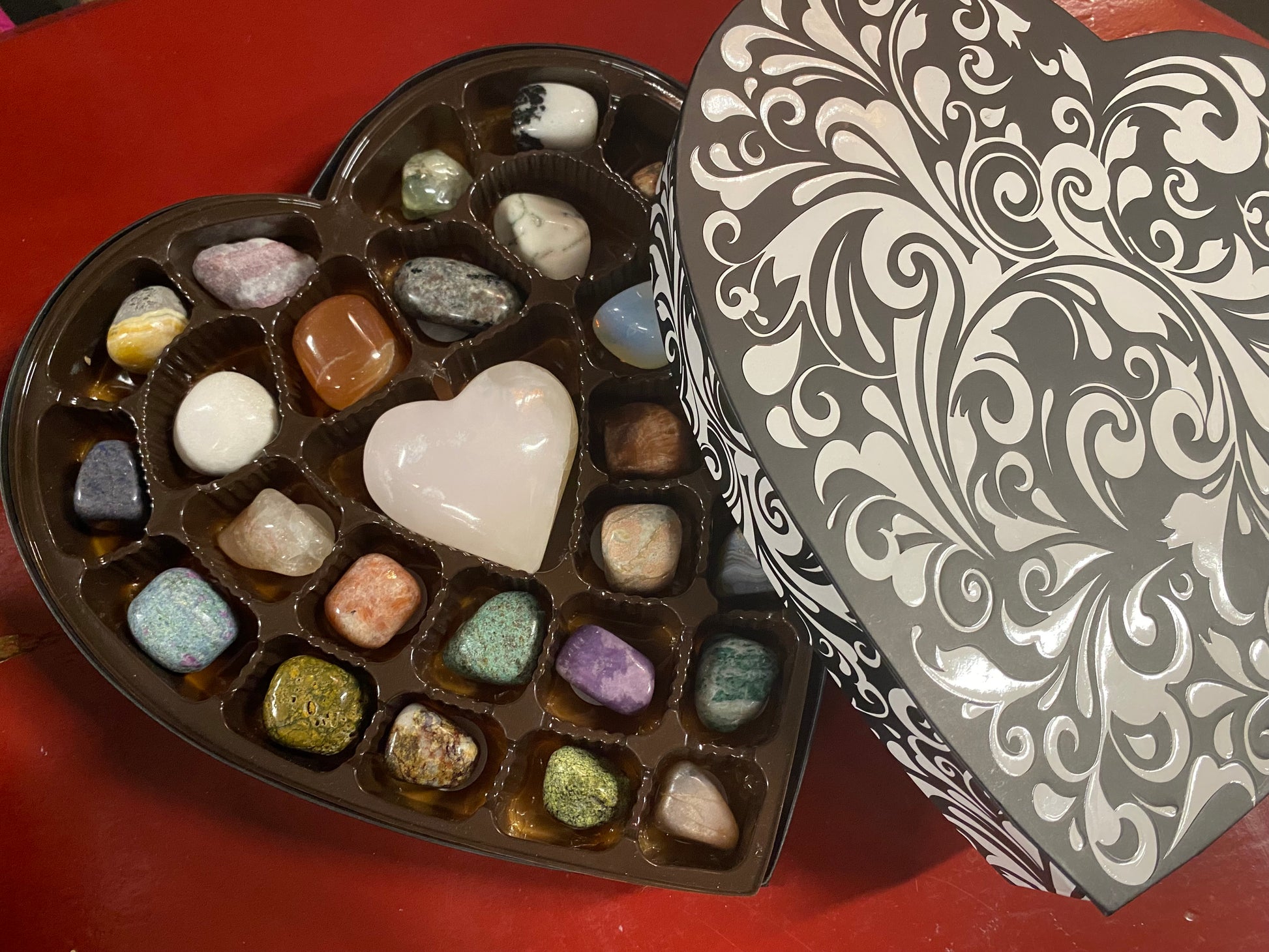 Our crystal collection heart gift boxes each come with a 2" mangano calcite heart and a variety of tumbled stones. Our small box contains 12 total stones (including the 2" heart) and the large box contains 27 stones (including the 2" heart). Each set comes with metaphysical descriptions on the lid of the box. Descriptions are for entertainment purposes only. Keep out of reach of young children.