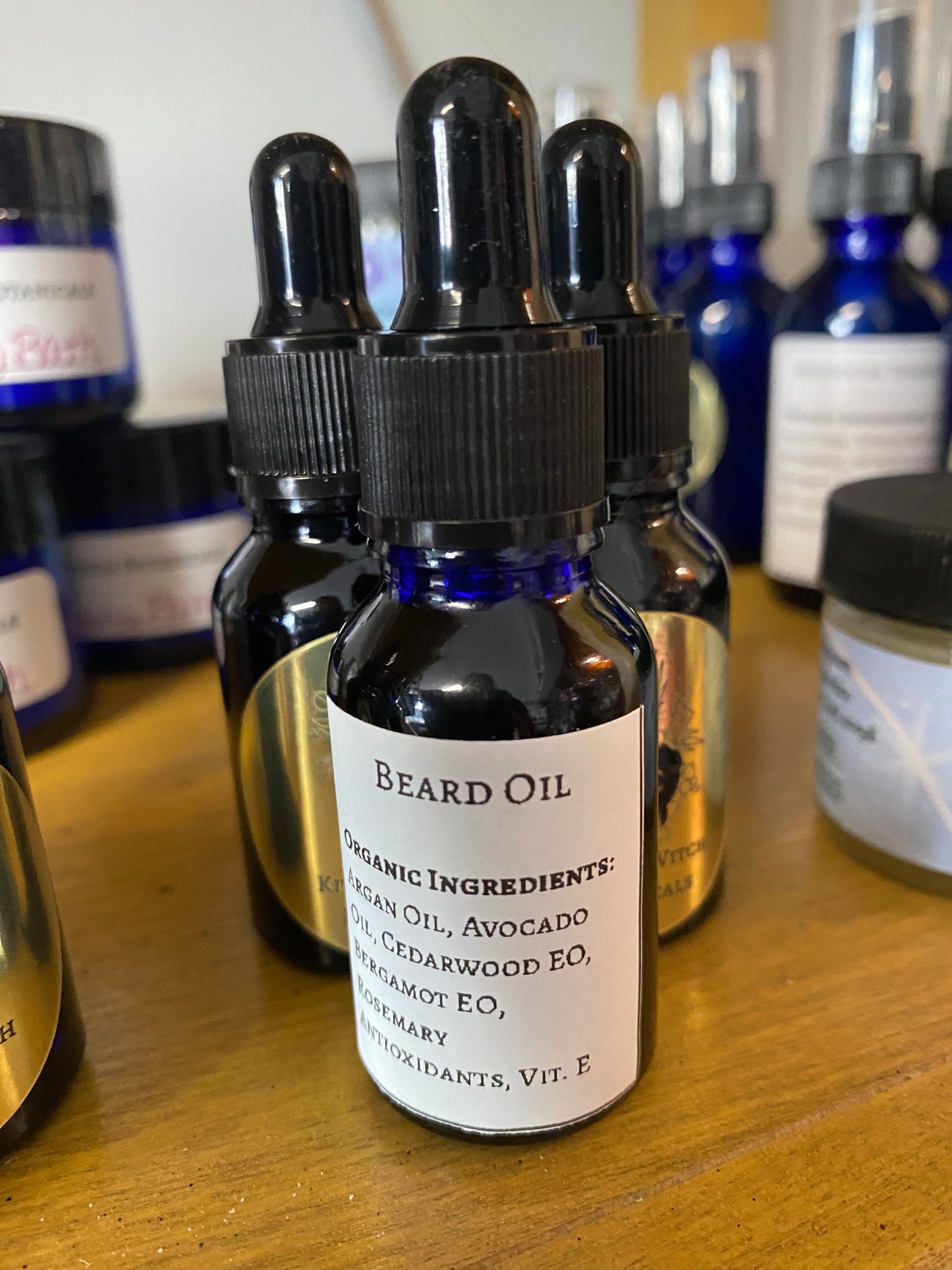Kitchen Witch Botanicals Beard Oil handcrafted with argan oil and avocado blended with cedar wood & bergamot essential oils and rosemary antioxidants & vitamin e.