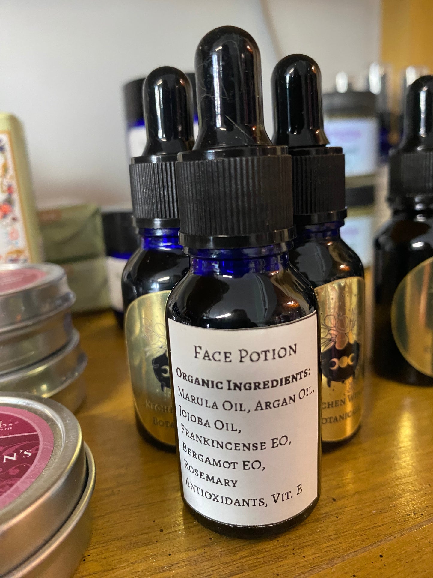 Kitchen Witch Botanicals Face Potion that includes a blend of Marula, argan, and jojoba oils with frankincense and bergamot eos, rosemary antioxidants, and vitamin e used to moisturize your skin.