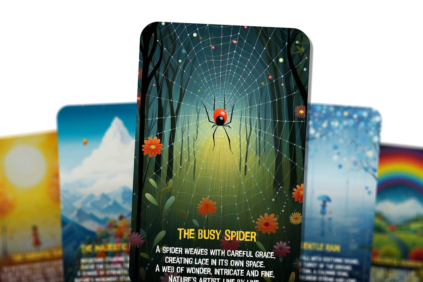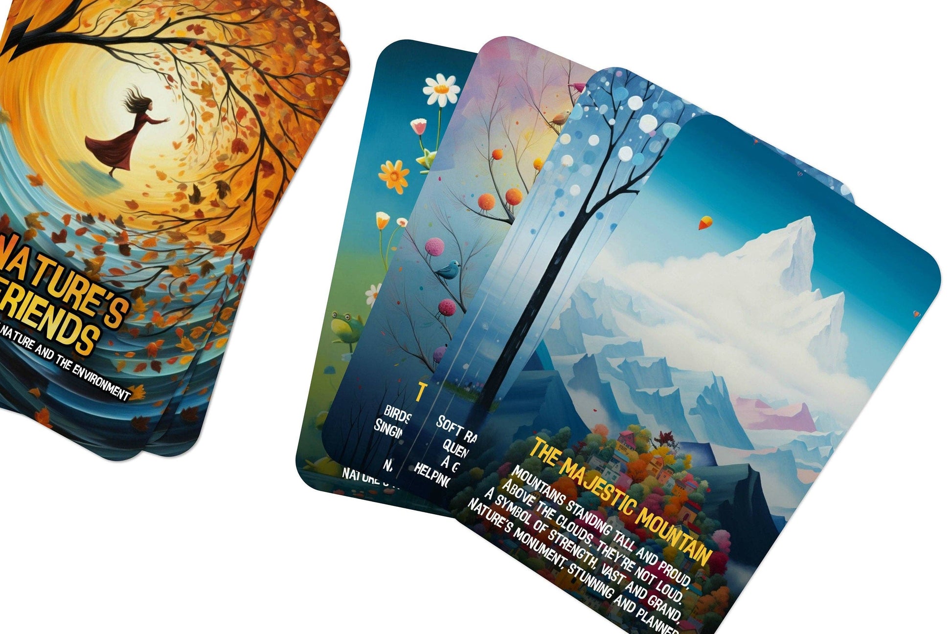 Embark on a delightful exploration of the natural world with "Nature's Friends: A Journey Through Rhymes." This enchanting deck of 22 beautifully illustrated cards is designed to captivate and educate children about the wonders of nature. Each card features a charming, easy-to-understand rhyme that brings to life a different element of the environment, from the busy bee and the laughing brook to the majestic mountain and the playful wind.