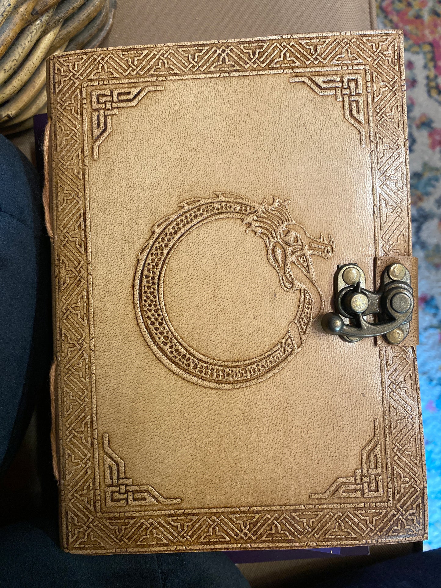 This exquisite 5" x 7" journal features a light brown leather cover adorned with a striking dragon head design encircled at the center. The intricate Celtic knot work elegantly frames the cover, enhancing its aesthetic appeal. Secured with a durable latch, this journal is perfect for preserving your thoughts and ideas in a stylish and unique manner. Ideal for both personal use and as a thoughtful gift, it combines artistry with functionality.