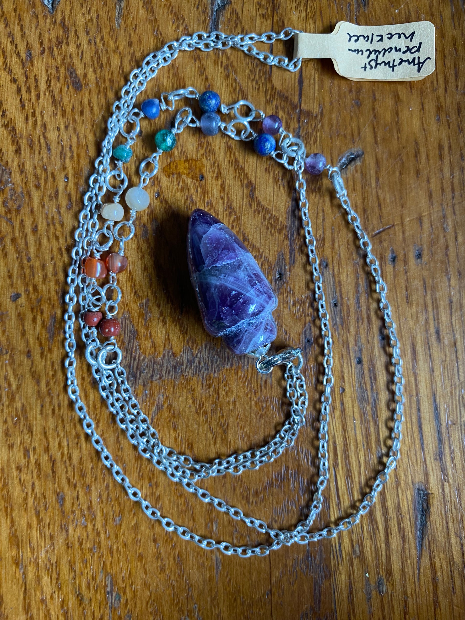 This striking necklace has a silver toned chain embellished with assorted gemstone beads and a pendant crafted from your choice of polished Clear Quartz, Rose Quartz, or Amethyst pendulum. Together they guarantee style, guidance and clarity will always be at hand. 34" chain included.