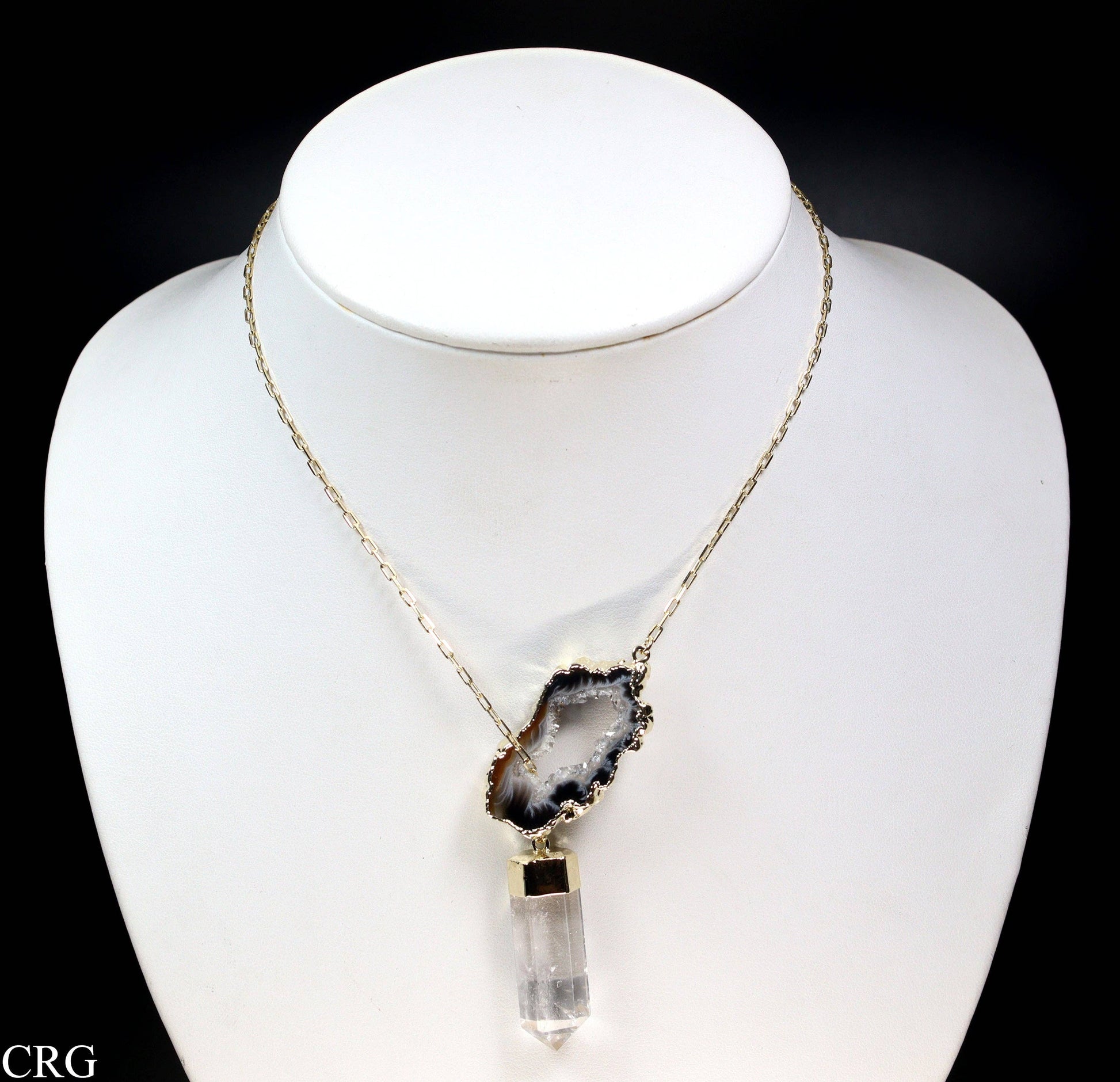Oco Geode Pendant with Gold Plating and Quartz Point on Y-Chain Necklace Origin: Brazil Pieces measure approximately 2 to 3 inches, excluding the necklace (AVERAGE SIZE) The picture is an example ONLY. This listing is for a 100% natural product. Please allow for variation in size, shape, color, and formation.