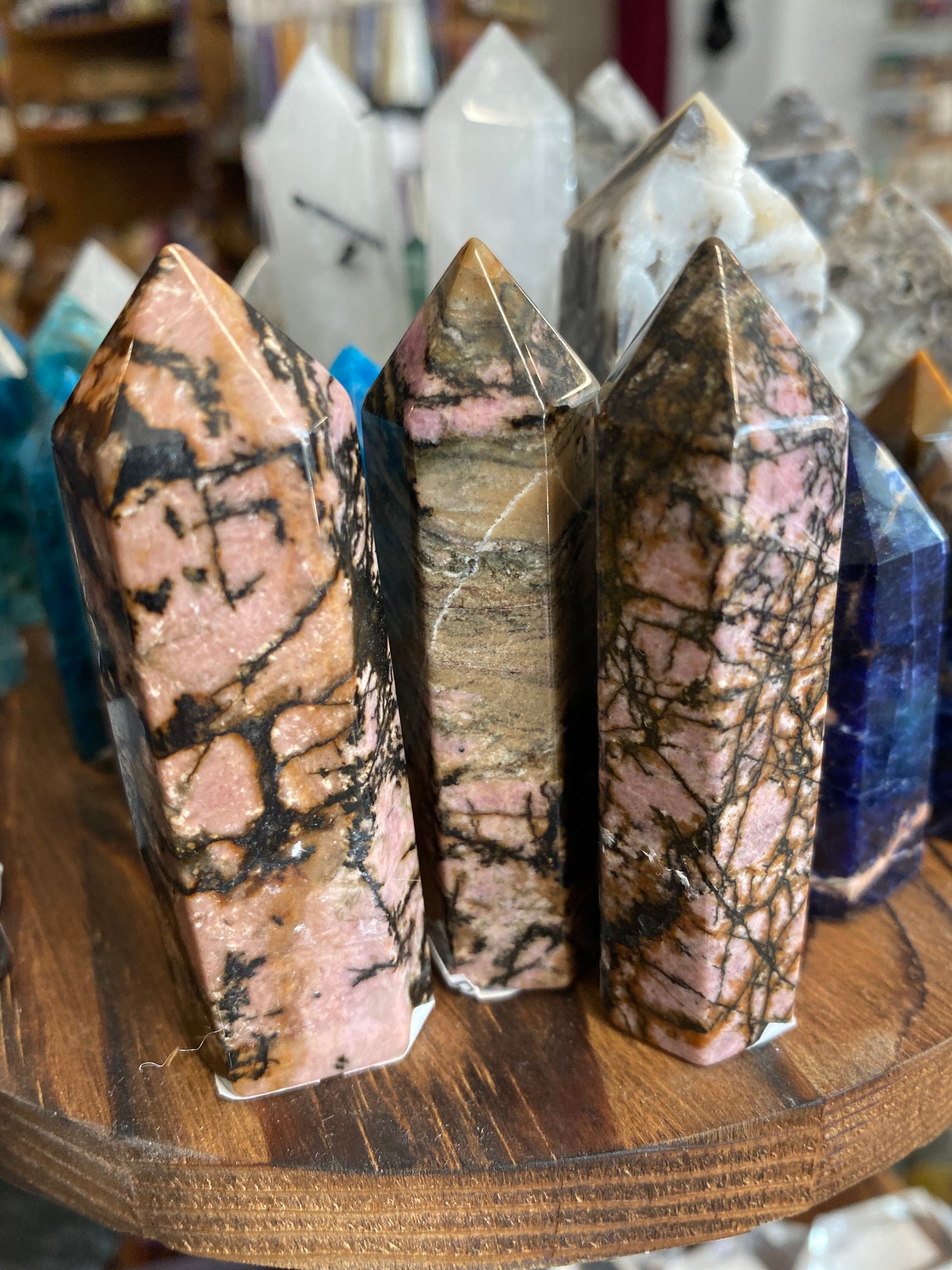 Rhodonite comes in colors that range from pale pink to a deep red. This beautiful crystal is a projective energy, vibrating the love energy outward. It has energetic powers that help with peace, confusion, doubt, incoherency, balance, stress, forgiveness, compassion, and is worn to shut down the psychic centers. Rhodonite works with the heart chakra and resonates with the planet Mars, with its element being Fire.