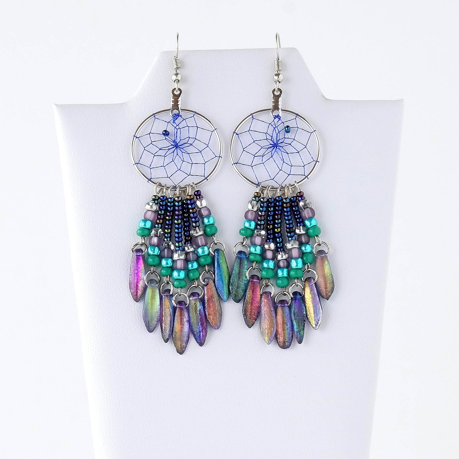 1" Dream Catcher Earrings detailed with peacock glass daggers and glass bead dangles.