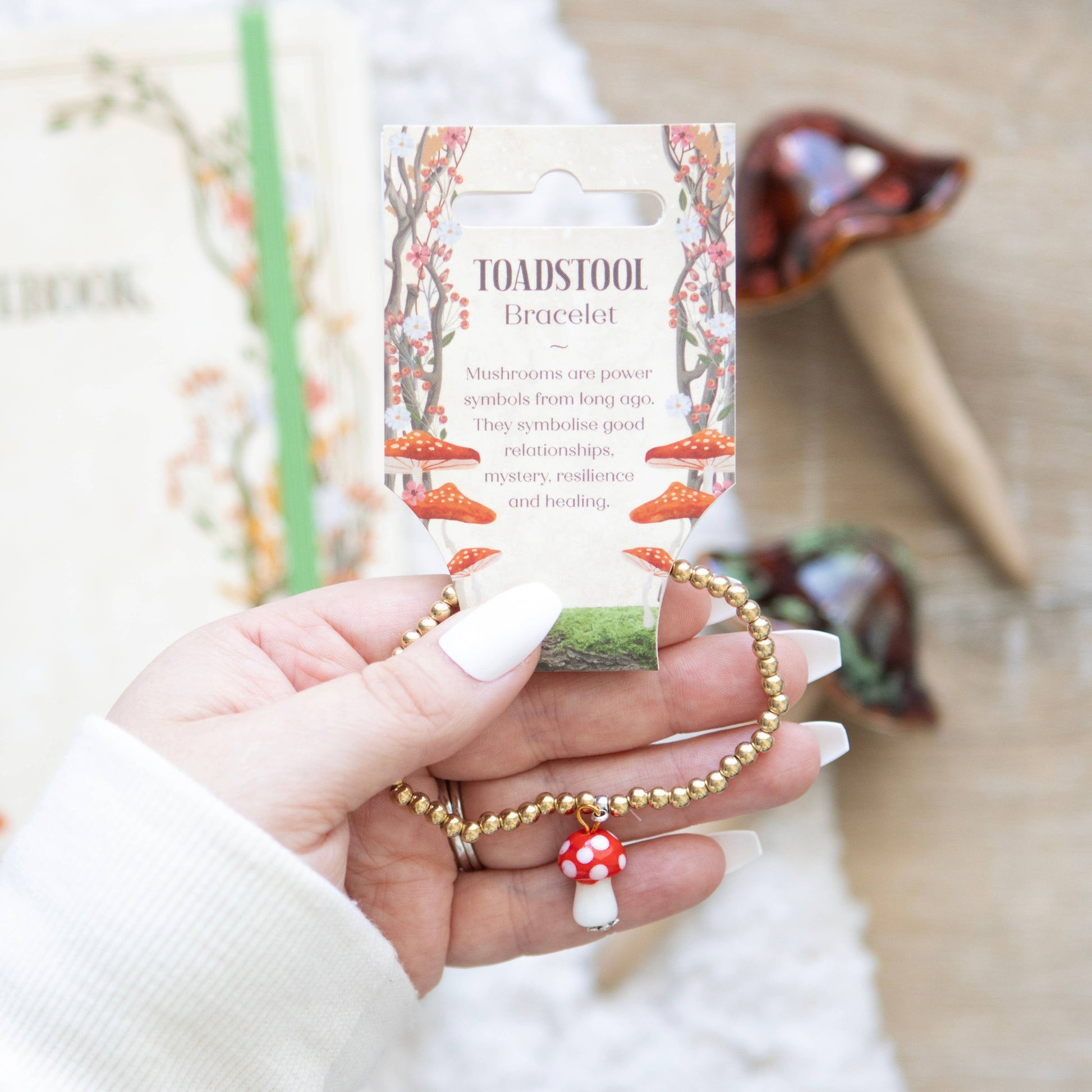 Add a touch of whimsical charm to your jewellery collection with this toadstool beaded charm bracelet. This delightful bracelet features an intricately designed toadstool mushroom that hangs gracefully from an elasticated, gold beaded bracelet, and comes with a matching informational tag. Mushrooms are a symbol of good relationships, mystery, resilience and healing, making this bracelet a perfect gift for nature lovers or those who appreciate unique jewellery.